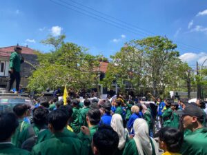 Tulungagung – Ratusan mahasiswa dari PMII dan UIN Tulungagung melakukan aksi unjuk rasa di Kantor DPRD Tulungagung, Kamis siang.