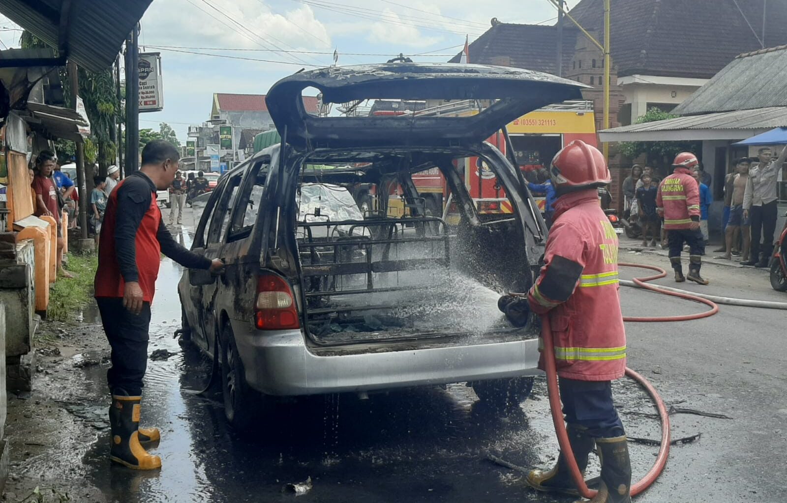 Iwan Supriyono, Kasi Penyelamatan & Evakuasi Dinas Pemadam Kebakaran & Penyelamatan Tulungagung mengatakan mobil KIA Carnival nopol AG 1828 RG milik Suwanto warga Mirigambar Sumbergempol ludes terbakar di sekitar kawasan Pasar Bendilwungu Kecamatan Sumbergempol sekitar jam 12 siang tadi.